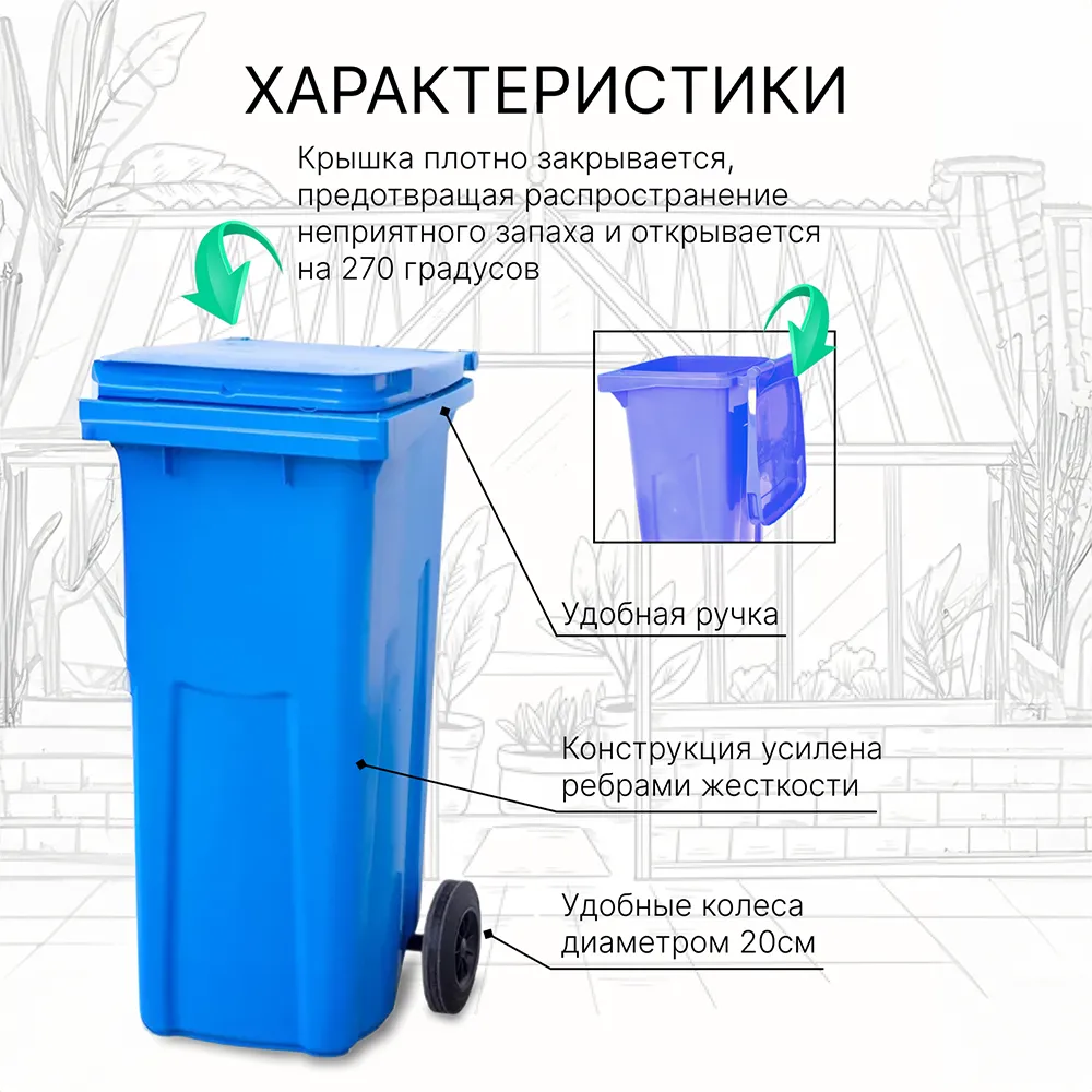 Контейнер для мусора — идеальное решение для поддержания чистоты в различных условиях. Мусорный бак уличный создан специально для комфортного и удобного сбора отходов. Этот контейнер впечатляет своей вместительностью, что позволяет разместить всё необходимое. Бак мусорный сделан из качественного морозостойкого пластика, что гарантирует долговечность даже при низких температурах. Особенность этой модели - колеса, благодаря которым перемещать емкость становится значительно проще и удобнее. Мусорный бак на колесах не требует особых усилий для транспортировки, что особенно ценно при необходимости перемещения его по территории. Крышка надежно закрывает содержимое, препятствуя распространению запахов и защищая от осадков. Мусорный бак 120 литров подойдет как для использования в частных домах, так и на общественных пространствах. Его практичность и функциональный дизайн делают его незаменимым помощником в быту. Также в дополнение к баку можно приобрести пакетодержатель.