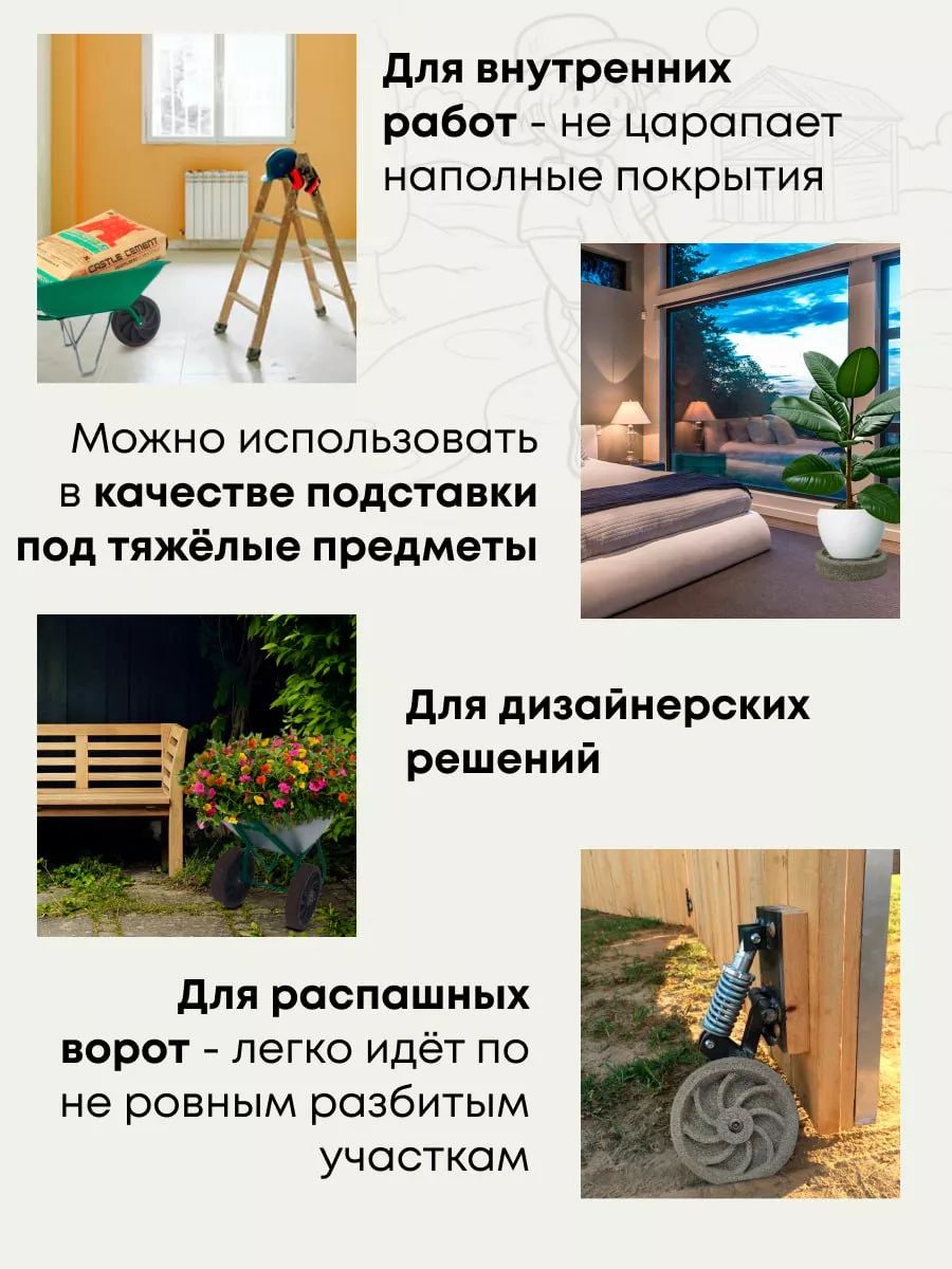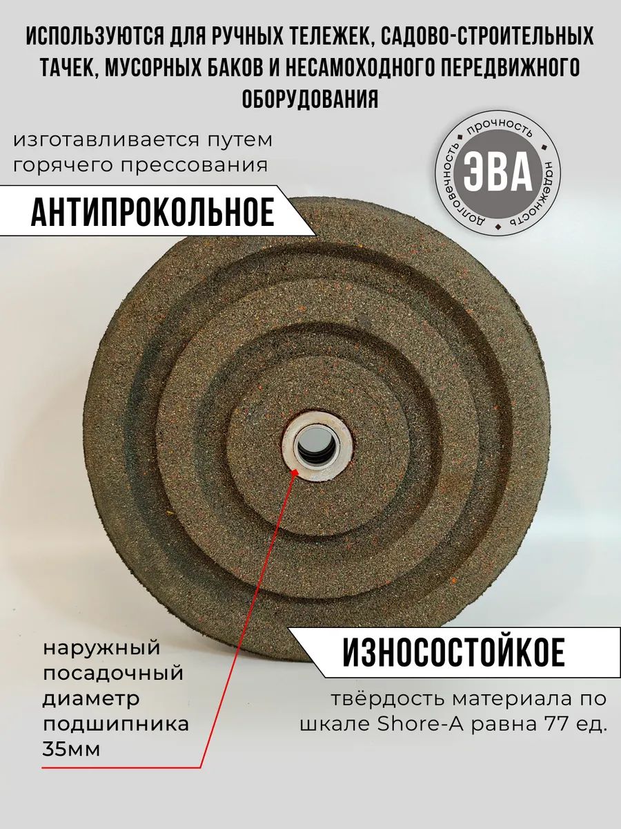 Колеса ЭВА-ЭКО предназначены для ручных тележек, садово-строительных тачек, мусорных баков и несамоходного передвижного оборудования. Они цельнолитые, изготовлены методом горячего прессования из экологически чистого сырья и обладают высокой износостойкостью с твердостью 77 единиц по шкале Shore-A. Эти колеса устойчивы к жаре, морозу, влаге и химически активным веществам, что позволяет использовать их в различных погодных условиях и на грубых, рыхлых и скользких покрытиях. Колеса оснащены металлическим подшипником, имеют диаметр 250 мм, ширину профиля 65 мм, наружный посадочный диаметр подшипника 35 мм и посадочный диаметр 20 мм. Рабочая нагрузка составляет до 600 кг.