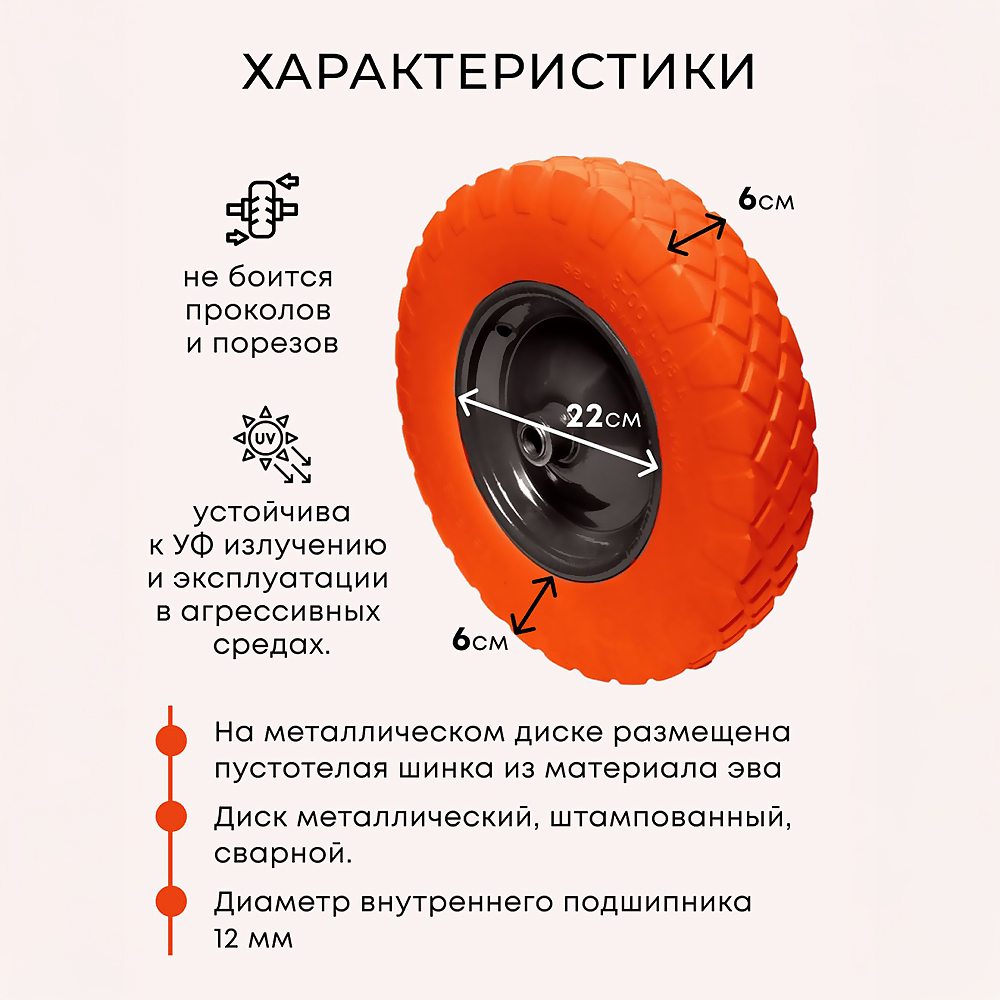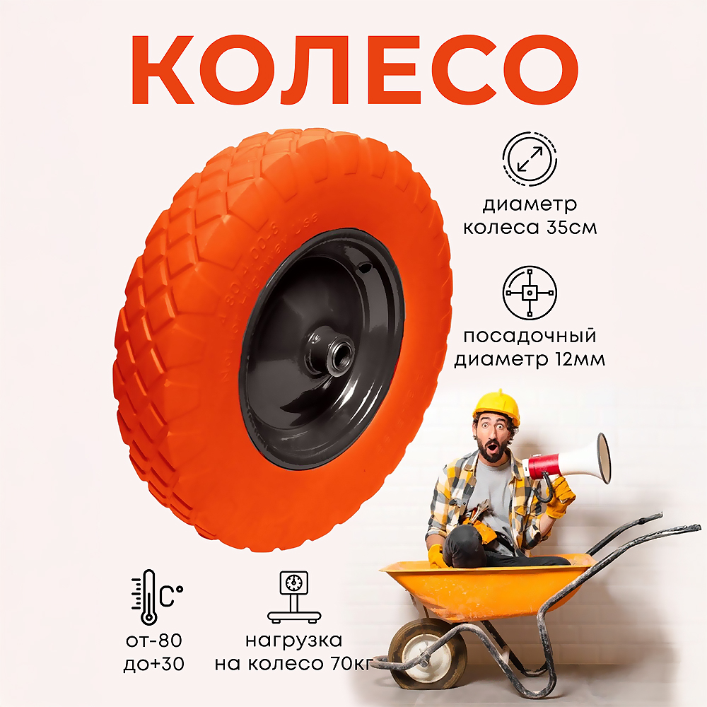 Колесо предназначено для комплектации строительных и дачных тележек, а так же для распашных ворот. Диаметр колеса 35 см(+/- 1 см), диаметр диска 22 см, ширина колеса 6 см, высота шинки 6 см. На металлическом диске размещена пустотелая шинка из материала ЭВА. Диск металлический, штампованный, сварной. Диаметр отверстия у внутреннего подшипника 12 мм. Шинка не боится проколов и/или порезов, устойчива к УФ излучению и эксплуатации в агрессивных средах. Допустимая нагрузка на одно колесо 70 кг. Разрешенный температурный режим эксплуатации -80 С/+30 С.