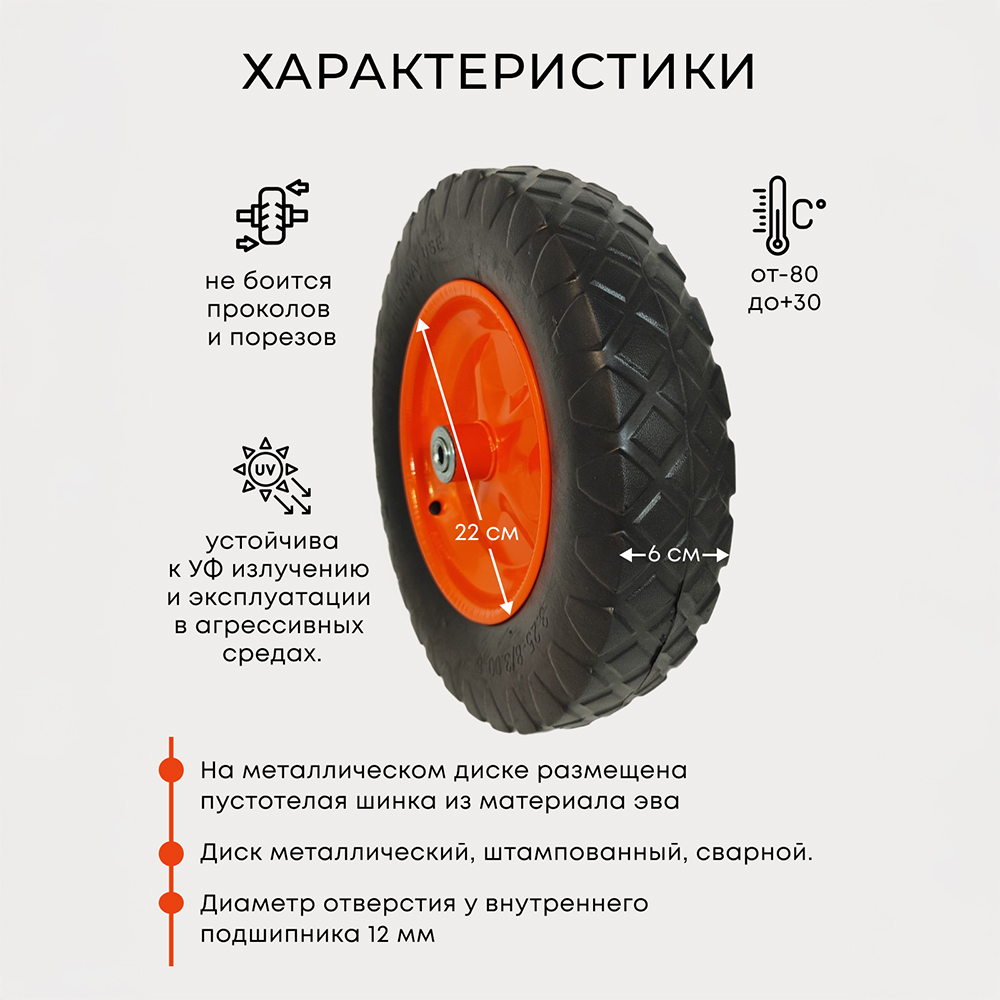 Колесо предназначено для комплектации строительных и дачных тележек, а так же для распашных ворот. Диаметр колеса 35 см(+/- 1 см), диаметр диска 22 см, ширина колеса 6 см, высота шинки 6 см. На металлическом диске размещена пустотелая шинка из материала ЭВА. Диск металлический, штампованный, сварной. Диаметр отверстия у внутреннего подшипника 12 мм. Шинка не боится проколов и/или порезов, устойчива к УФ излучению и эксплуатации в агрессивных средах. Допустимая нагрузка на одно колесо 70 кг. Разрешенный температурный режим эксплуатации -80 С/+30 С.