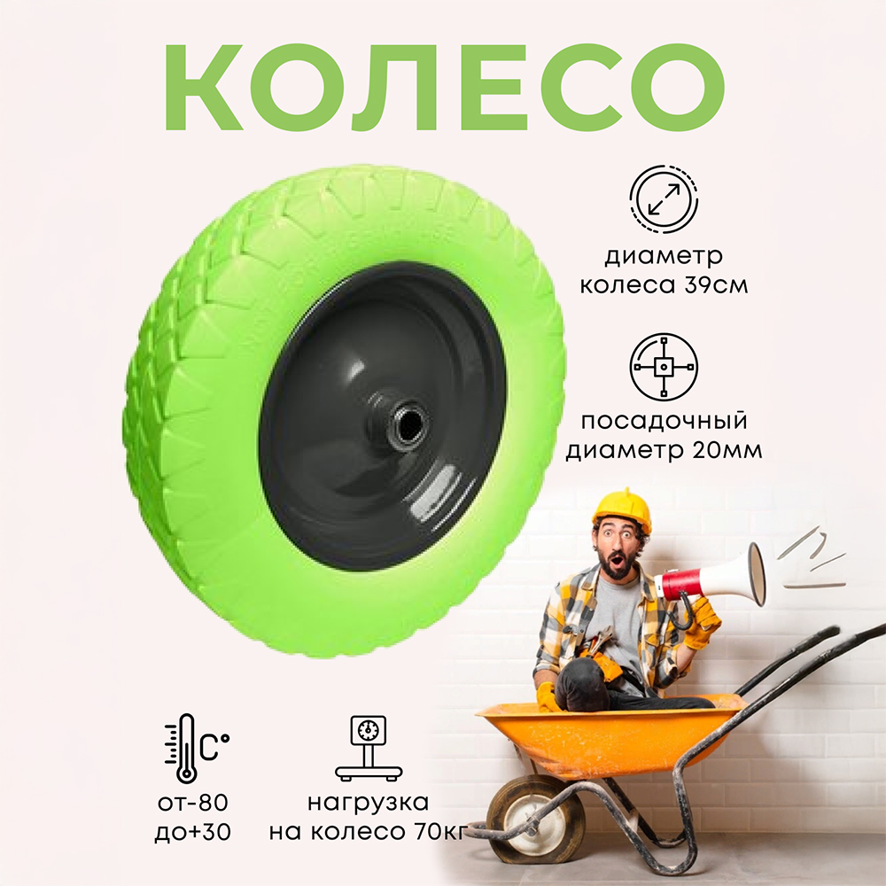 Колесо предназначено для комплектации строительных и дачных тележек, а также для распашных ворот. Диаметр колеса 39 см(+/- 1 см), диаметр диска 22 см, высота шинки 8 см, ширина колеса 8 см.На металлическом диске размещена пустотелая шинка из материала ЭВА. Диск металлический, штампованный, сварной. Диаметр внутреннего подшипника 20 мм. Шинка не боится проколов и/или порезов, устойчива к УФ излучению и эксплуатации в агрессивных средах. Допустимая нагрузка на одно колесо 70 кг. Разрешенный температурный режим эксплуатации -80 С/+30 С.