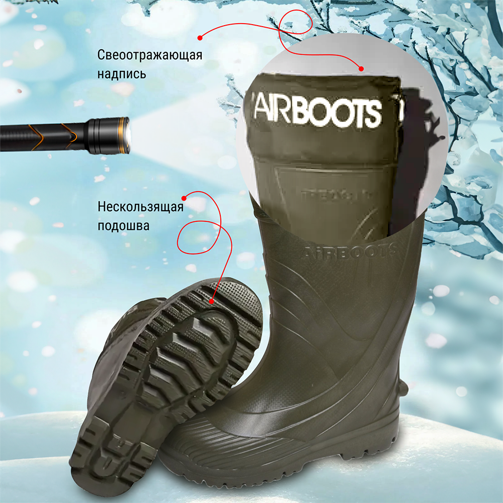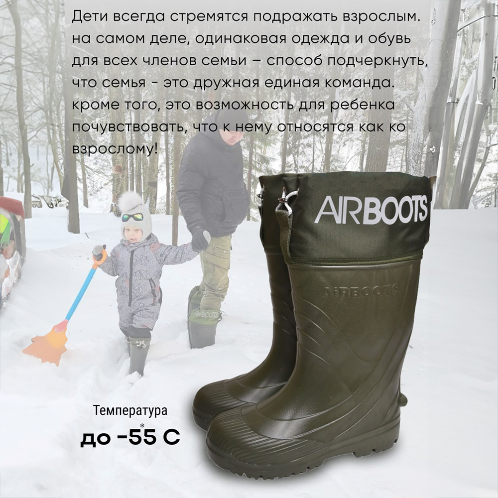 Сапоги зимние детские Airbootskids-MU изготовлены из ЭВА, это прочный, износостойкий, легкий и теплый материал. Это первые резиновые сапоги, которые "научились дышать", тем самым создавая оптимальный микроклимат внутри, благодаря особой запатентованной системе, действующей по принципу "камина". Сапоги зимние детские имеют систему влагоотводящих каналов, по ним теплый влажный воздух отводится из сапога не позволяя образовываться конденсату. Ноги в такой обуви не потеют. Сапоги ЭВА комплектуются утепленным вкладышем, благодаря которому зимние прогулки стали комфортней. Первый слой не тканое полотно толщиной 3 мм, второй слой - объемный мех из 100 % хлопка, состав меховых волокон: 70 % натуральная шерсть, 30 % искусственное волокно. Сапоги выполнены с усиленным носком. Дети всегда стремятся подражать взрослым. На самом деле, одинаковая одежда и обувь для всех членов семьи – способ подчеркнуть, что семья - это дружная единая команда. Кроме того, это возможность для ребенка почувствовать, что к нему относятся как к взрослому!