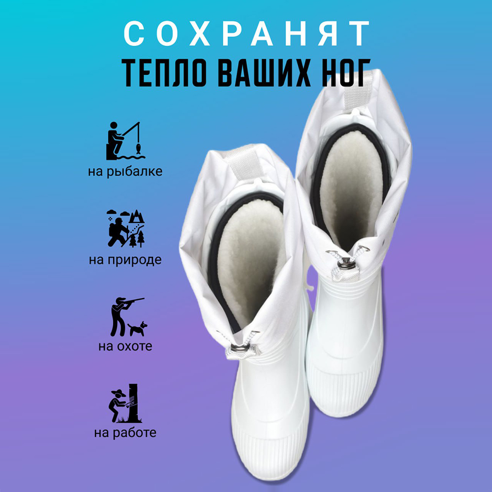 У вас есть прекрасная возможность приобрести фольгированный сменный утеплитель для сапог! Вкладыш-утеплитель обеспечит надежную защиту от холода и создаст комфортную атмосферу в вашей обуви. Сапоги больше не будут вызывать дискомфорт в прохладную погоду. Вкладыши можно использовать в качестве домашней обуви в плохо отапливаемых и неотапливаемых помещениях, домах и дачах, постройках с холодным полом. Термовкладыши являются идеальным решением для тех, кто хочет сохранить тепло своих ног в обуви. Наши валенки созданы специально как вкладыш-чулок в резиновую обувь. Благодаря своей фольгированной структуре, они замечательно сохраняют тепло и защищают от пониженных температур. Внутренний чулок вкладыш в сапог под брендом "Колесник" имеет следующую структуру: первый слой фольгированный материал, второй слой нетканое полотно толщиной 3 мм, третий слой - объемный мех. Меховой слой имеет основу из 100 % хлопка, состав меховых волокон: 40 % натуральная шерсть, 60 % искусственное волокно. Вкладыши для обуви из такого материала сохраняют тепло при температуре -55 С. С помощью этого сменного утеплителя вы сможете наслаждаться каждой прогулкой в любую погоду. Он отлично подойдет для использования в зимний сезон или в прохладные весенние и осенние дни. Ваша обувь будет оставаться теплой и уютной. Такой вкладыш-утеплитель – незаменимый аксессуар для всех любителей активного отдыха и прогулок на свежем воздухе. Он обеспечивает полную свободу движения и комфорт при ходьбе. Подарите своим ногам заботу и уют с нашим фольгированным сменным утеплителем для сапог! Вкладыши для резиновых сапог и зимней обуви защитят от холода во время зимней рыбалки и охоты. Теплый меховой вкладыш для обуви - это отличный подарок для любителей охоты и рыбалки. Вставка в обувь заменит носки теплые мужские зимние. Вкладыши в сапоги подойдут для мужчин, для женщин, подросткам, также в наличии большие размеры.